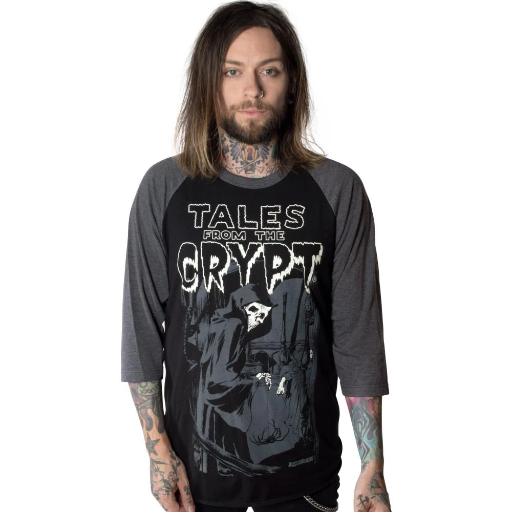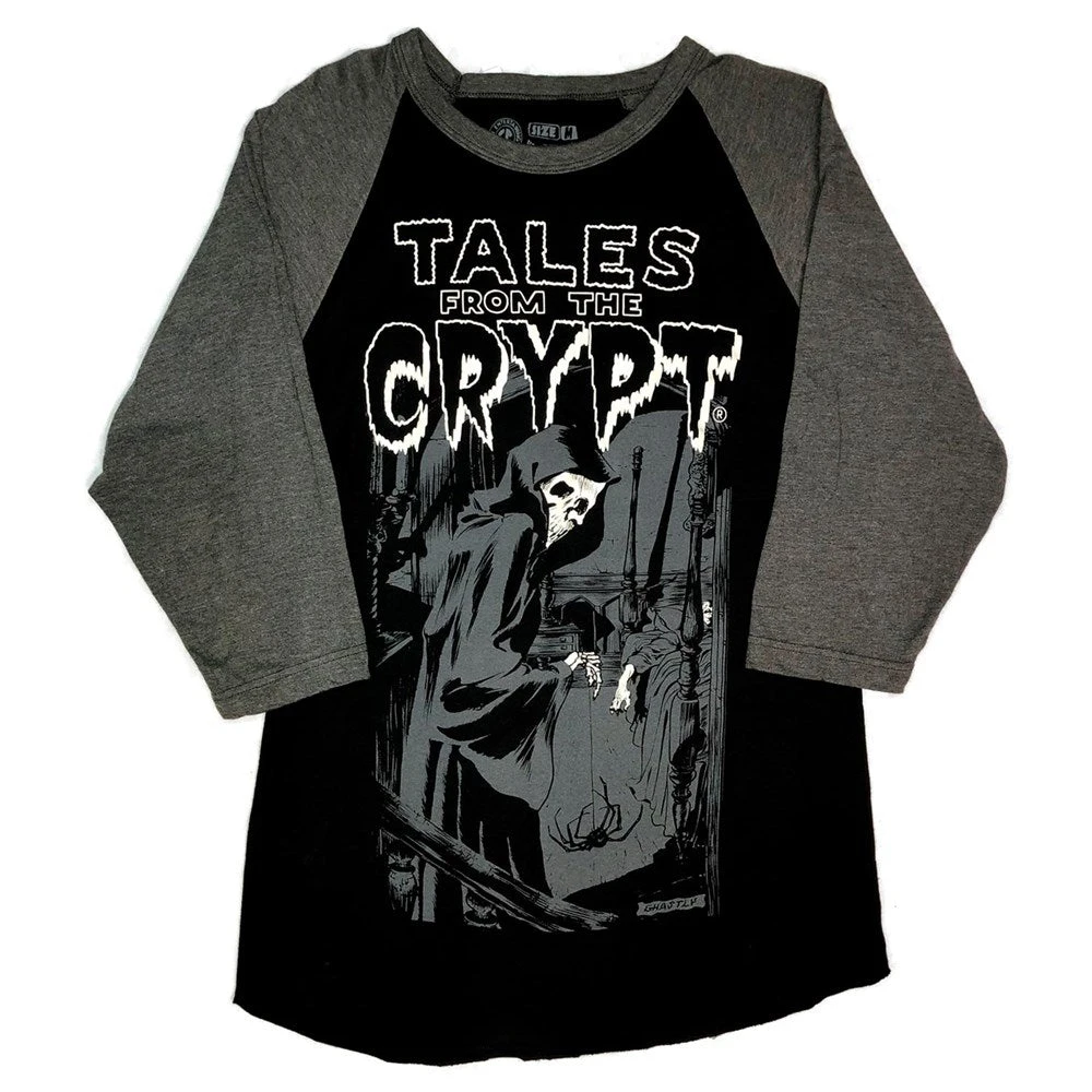 Official Tales From the Crypt Grim Reaper 3/4 sleeve raglan tee, slim fit 100% cotton tee with contrast heather sleeves , screened image with spooky glow in the dark reveal when the list go out!!! Printed in the USA.