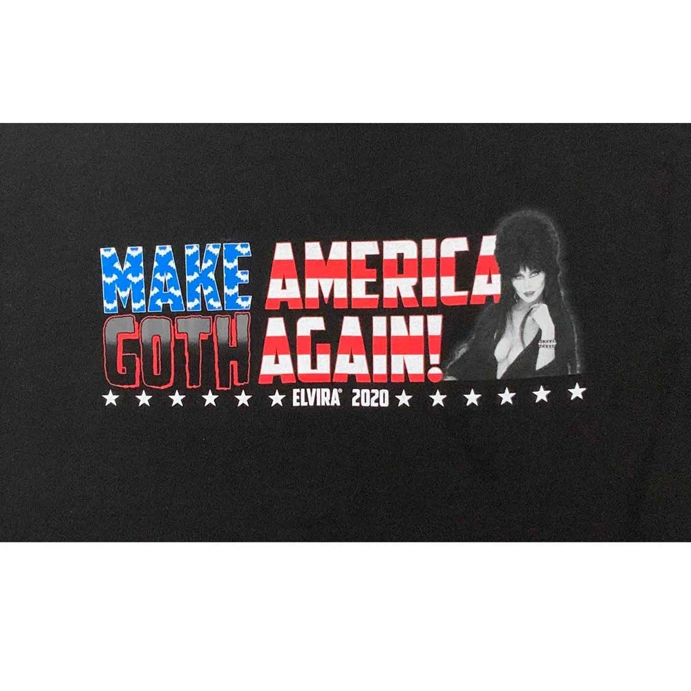 Official licensed Elvira Mistress of the Dark Make America Goth Again Campaign Merch T-Shirt. 100% Cotton screened t-shirt , Printed in the USA.