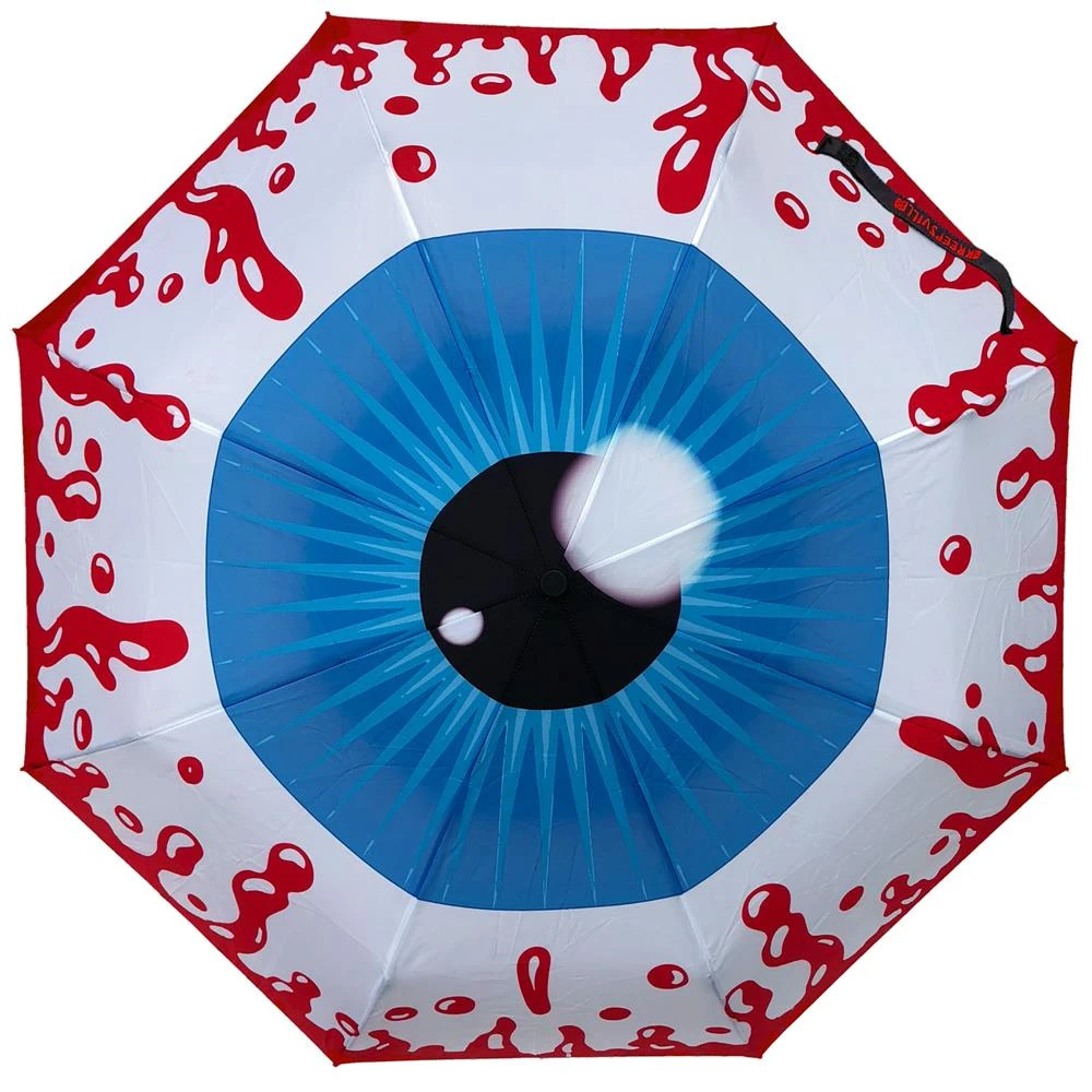 Kreepsville eyeball skull handle umbrella, high quality auto pop up umbrella with black metal plated shaft and Kreepsville black metal plated skull handle, Size approx 42 in dia. Easy carry loop handle and umbrella sleeve included.