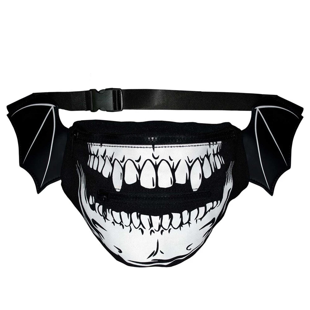 Sink your teeth into this Skull hip pouch! Featuring an adjustable strap and large clip with vegan leather wings and a canvas pouch printed with a white vamp skull print. Measuring approx. 6IN X 10IN X 2IN with two extra zippered compartments a small one in front and a large one in the back! Adjustable strap extend up to 33 inches. This is not your granny’s fanny pack!